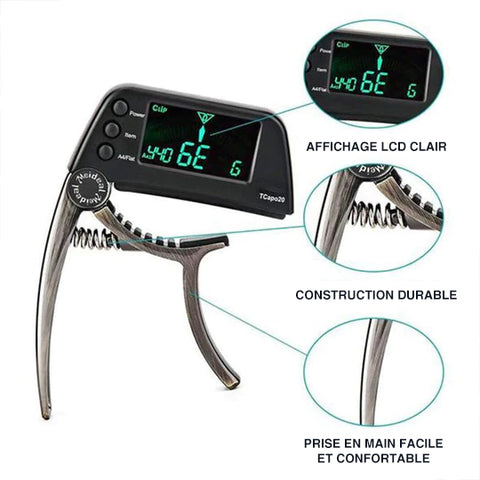 Capodastre et accordeur combinés en une seule pièce d'équipement d'instrument. Il permet d'accorder les chromatiques, les basses.