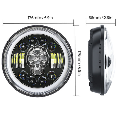 Le phare de crâne de 7" redessiné est polyvalent et peut être monté sur n'importe quel véhicule qui a actuellement un phare de 7" ou une zone de montage personnalisée de 7". Il est idéal pour des applications telles que les jeeps, les voitures classiques et les motos.