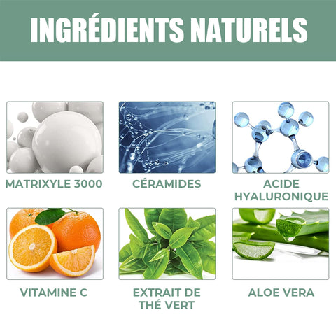 Céramides : les céramides sont naturellement présentes dans le corps. Ceci est extrêmement important pour la santé de la peau car ils font partie de la barrière naturelle de la peau. Ils hydratent toute la journée pour aider à restaurer la barrière protectrice de la peau, augmentant ainsi l'élasticité de la peau.
