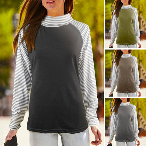 Design élégant - Sweat-shirt décontracté pour femme, couleur unie ; col empilé; conception de manches rayées pour plus de mode.
