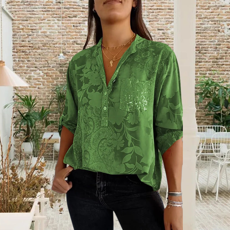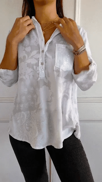 🎨 Elle porte le haut imprimé à col en V et demi-bouton ! 🌟 Élevez votre garde-robe avec cet ensemble chic qui ne manquera pas de faire tourner les têtes. 💃 Préparez-vous à faire sensation à chaque tenue ! 🔥