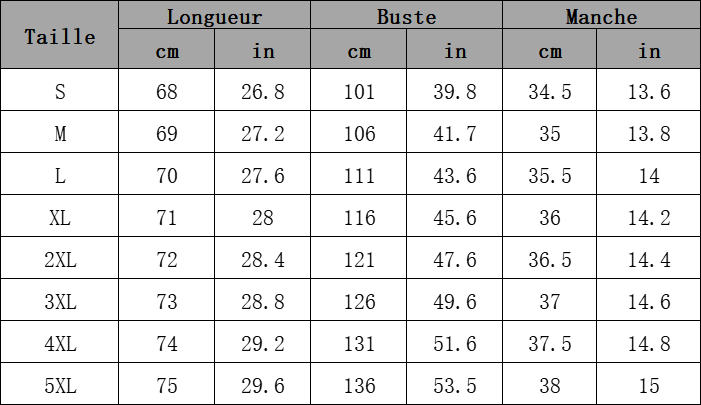 Taille: S/M/L/XL/2XL/3XL/4XL/5XL