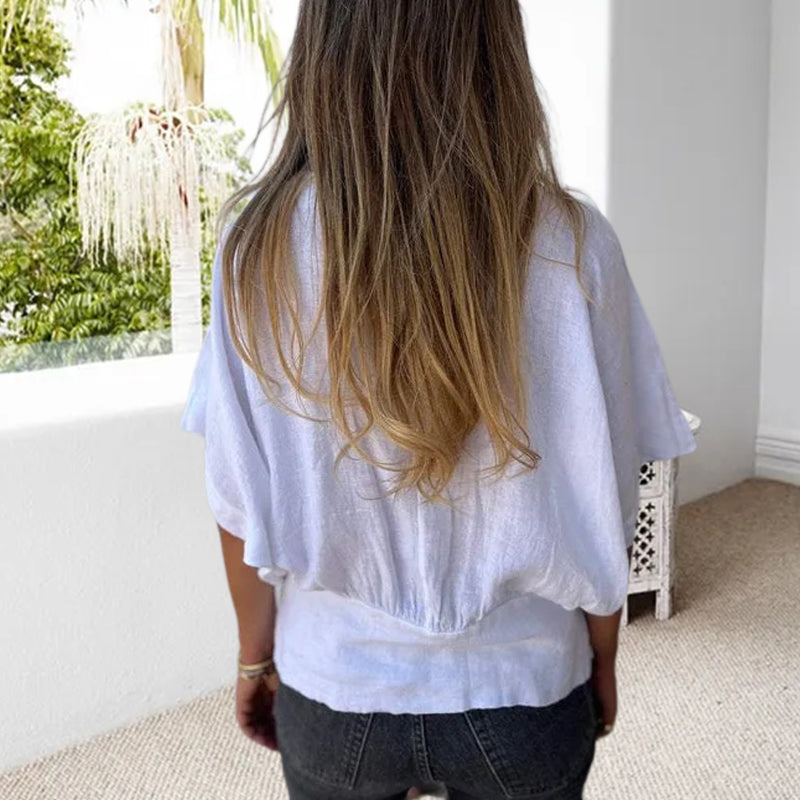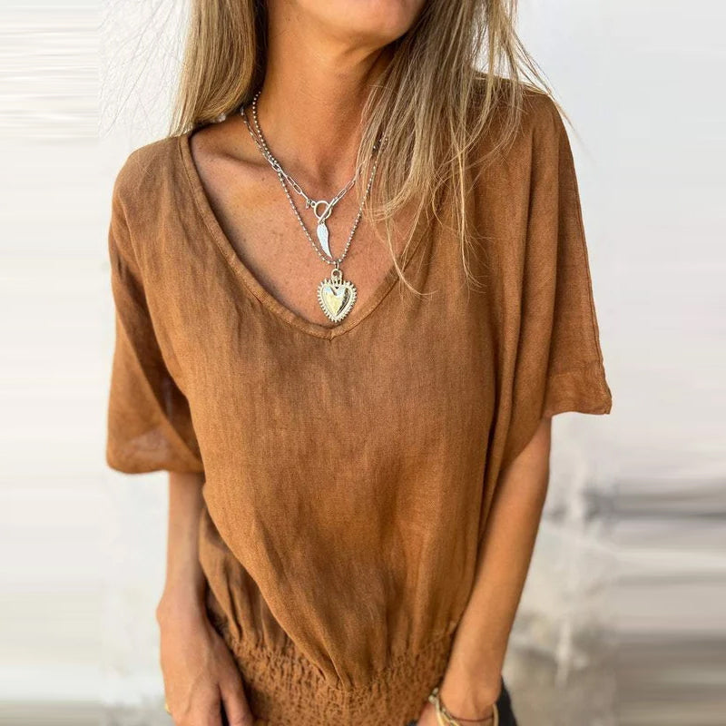 • 1*Tops à col V en coton et lin à ourlet smocké