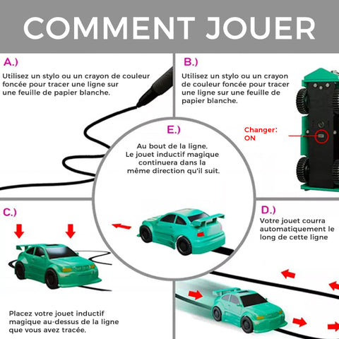 Un petit capteur sous la plaque inférieure de la voiture fait toute la magie. Tracez simplement une ligne avec le stylo magique inclus, placez la voiture sur cette ligne et elle suivra votre coup comme par magie.
