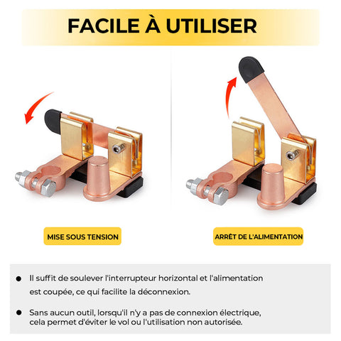 - Monté sur le pôle négatif de la batterie, l'autre extrémité du poteau est connectée au clip de la borne de la batterie pour s'étendre, la lame de la porte peut être ouverte et fermée pour connecter et déconnecter l'alimentation électrique.
