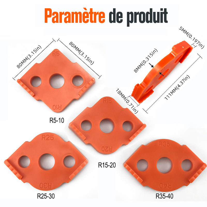 【Ce que vous obtenezã€?/strong>4 Pcs modèles de routeur pour le travail du bois, chaque routeur de gabarit de rayon comprend 8 types d'angle R5 R10 R15 R20 R25 R30 R35 R40.