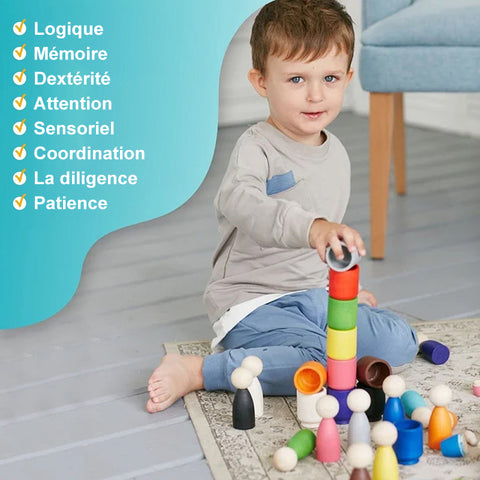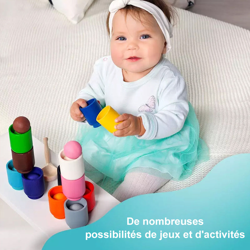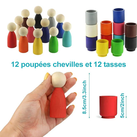 Correspondance et classification des couleurs: le bébé trie les différentes poupées à chevilles colorées dans les gobelets qui correspondent à la couleur, développant ainsi les capacités de réflexion logique de l'enfant!