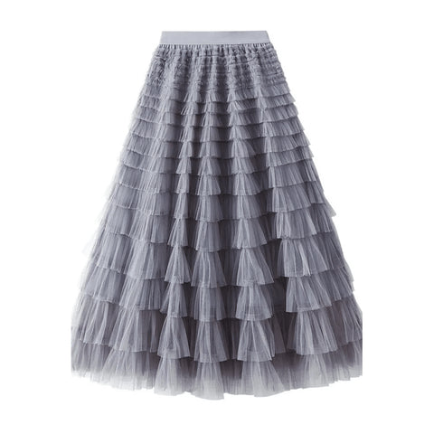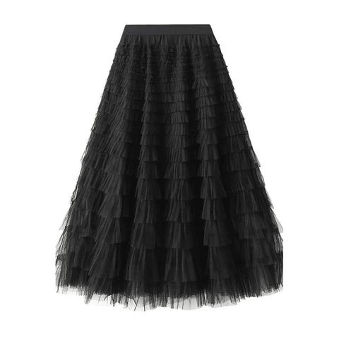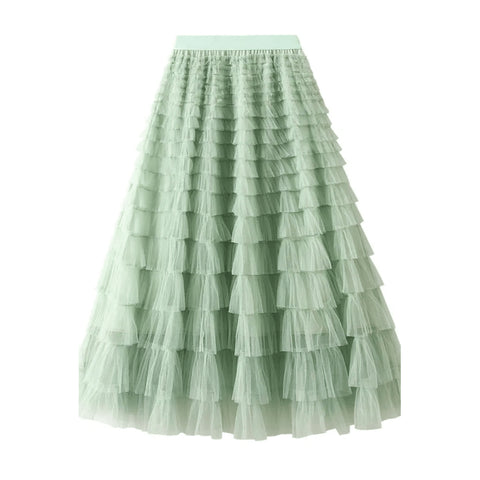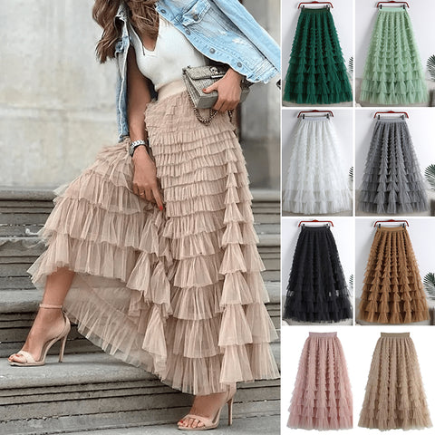 Jupes longues à coutures en tulle superposées 17/18, jupes longues à gâteau de princesse douce et mignonne, jupes midi à volants en maille, jupes en tulle de fée plissée, jupe de soirée, ceinture élastique, taille haute, balançoire fluide, ligne A, couleur unie.