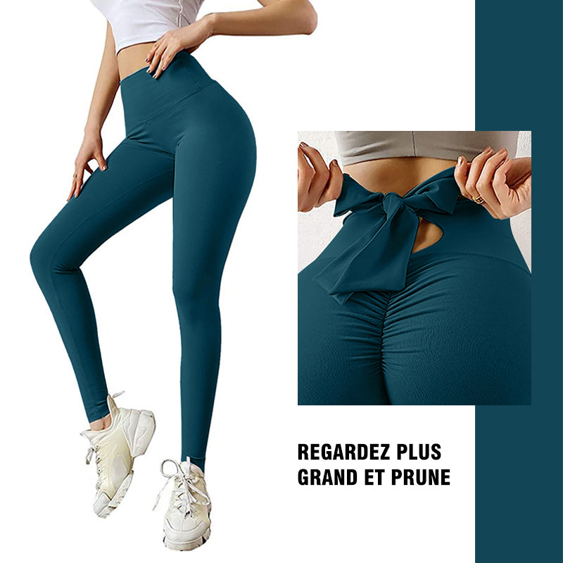 Notre pantalon de yoga taille haute moulant avec des nœuds et des plis à l'arrière, dessine une taille parfaite et des hanches pleines et sexy.