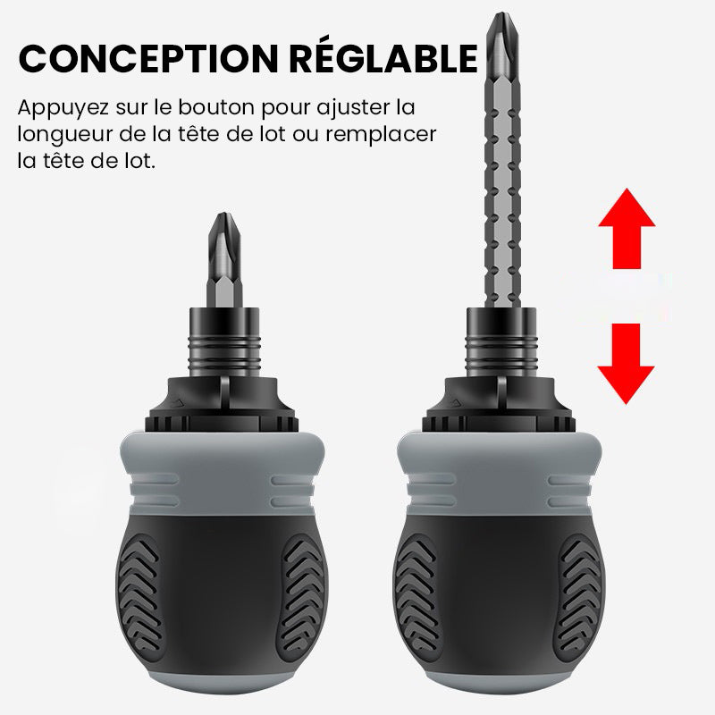 • Flexible et pratique: La longueur des embouts de tournevis est rétractable, il est donc pratique d'ajuster différentes longueurs, ce qui vous donne les caractéristiques dont vous avez besoin pour améliorer l'efficacité et l'efficience sur le chantier. Les zones tactiles de vitesse et de précision fournissent un contrôle rapide de la rotation pour des tâches efficaces d'exécution et de précision pour le tournevis à cliquet.