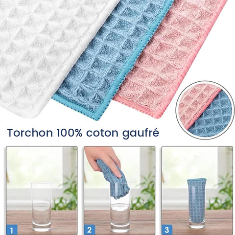 La technologie du tissage gaufré creux utilisée pour les torchons de cuisine les rend légers, aérés, extrêmement absorbants et rapides à sécher.