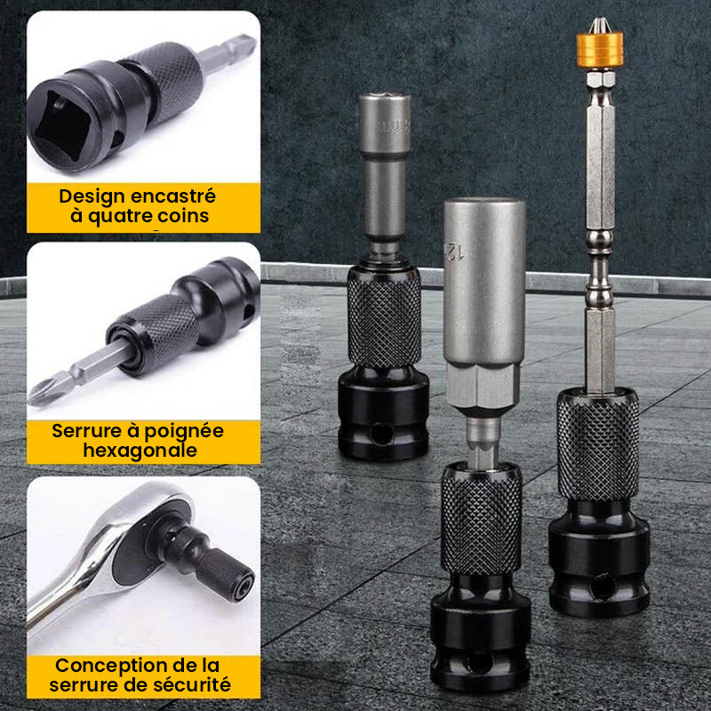 Utilisation sûre: L'attache rapide permet de changer très facilement d'embout de tournevis, de perceuse à tige hexagonale ou d'adaptateur de douille. C'est un adaptateur indispensable si vous avez l'intention de travailler sur des voitures ou des travaux de menuiserie à la maison.