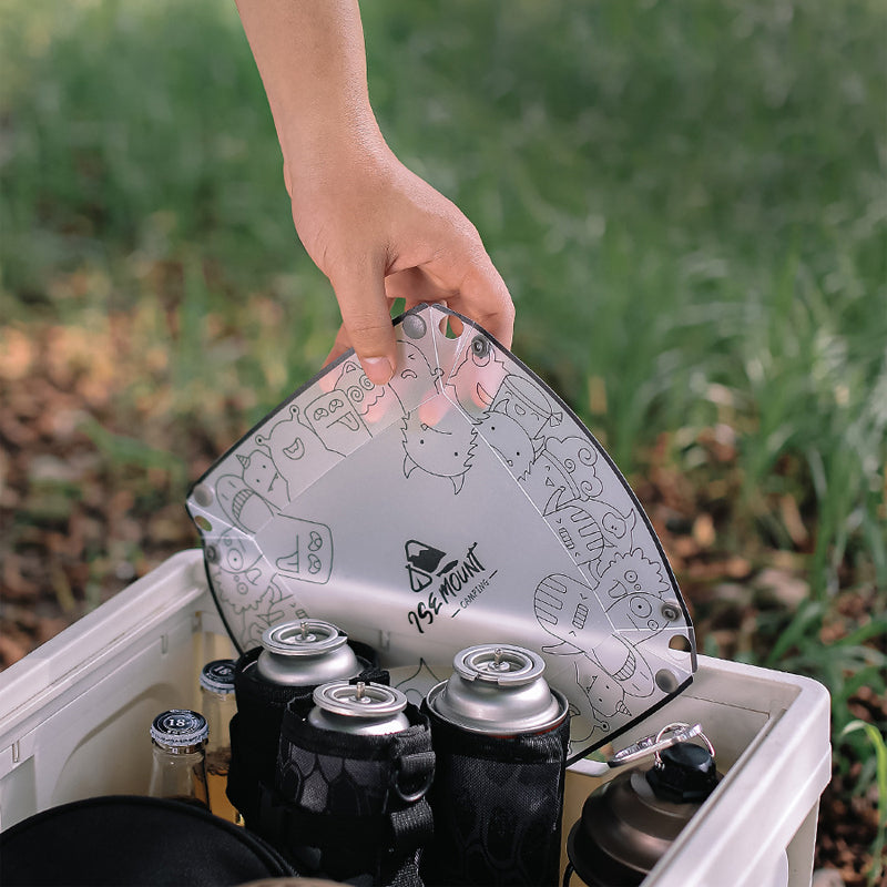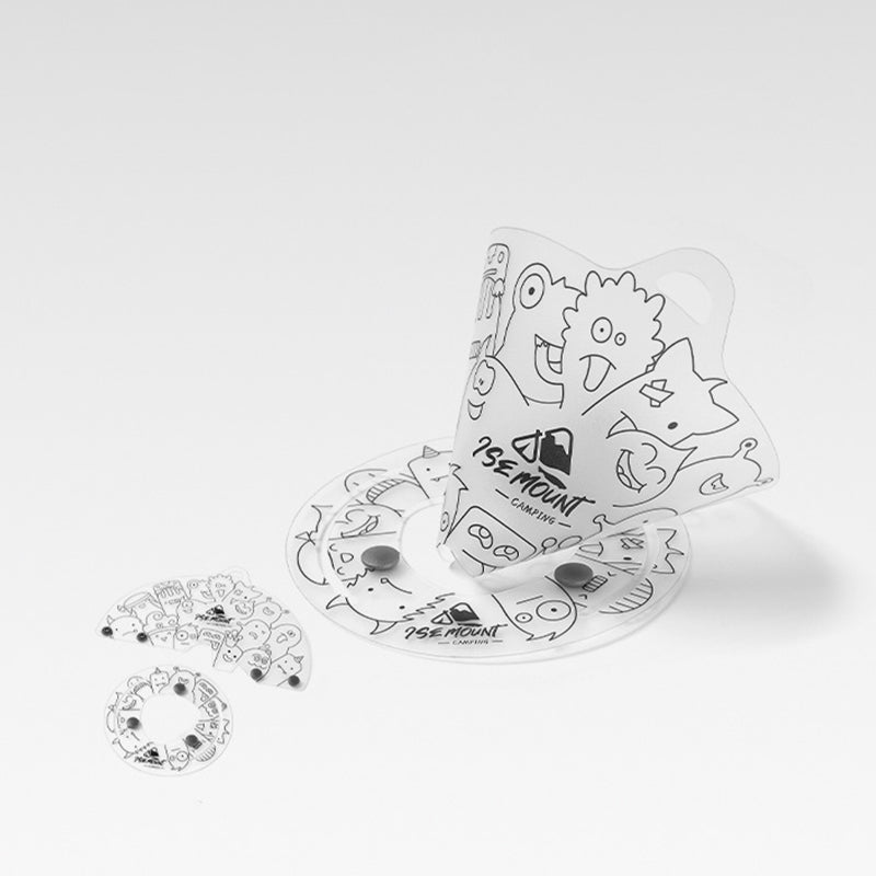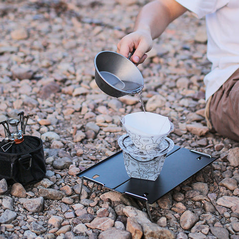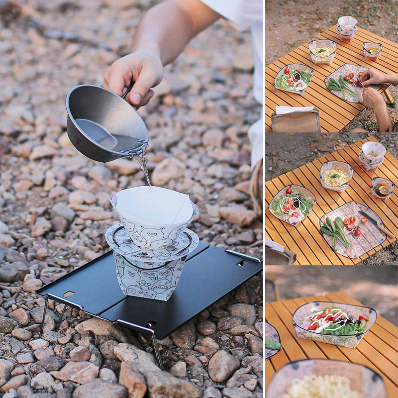 - Un bol pliable / Une tasse pliable / Une assiette plate pliable / Un filtre à café pliable / 4 couverts pliants