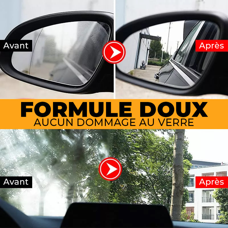 Il illumine en 1 touche, pénètre 3x et dissout les taches, élimine les légères taches d'eau caustiques et les pellicules d'huile sur le verre, etc. et restaure rapidement une transparence parfaite sans besoin de polissage.