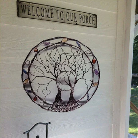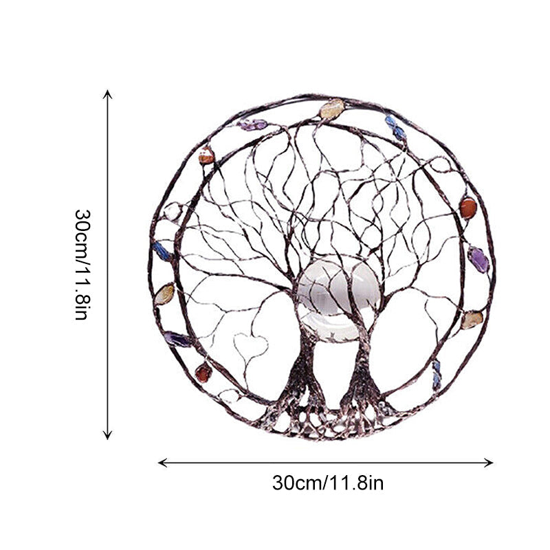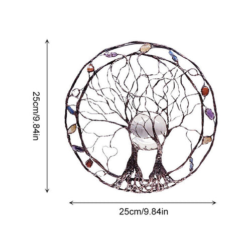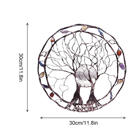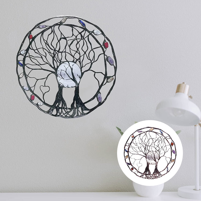 Sculpture d'arbre en métal Circle Of Life, The Moon Huggers, art mural ou de fenêtre avec rêveuse sélénite pleine lune et un mélange de minéraux.