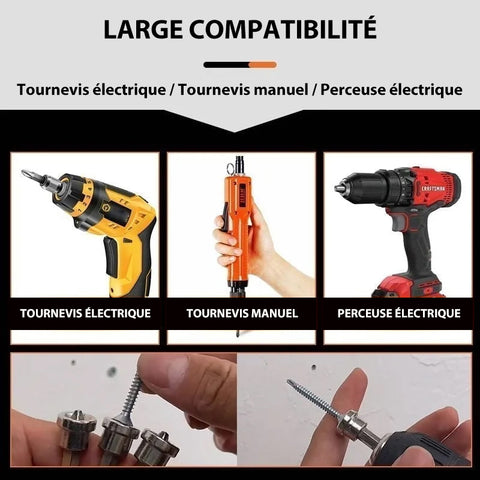 Ces embouts vous permettent de fixer la vis exactement à sa place sans vous soucier de l'oscillation ou de la mauvaise direction. Accélérez le processus de vissage pour travailler plus efficacement et plus facilement!