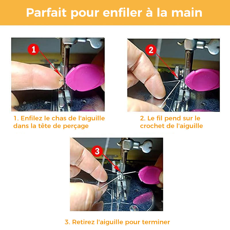 • Facile à utiliser: Vérifiez le trou d'un côté, insérez l'aiguille dedans, appuyez sur la partie centrale jusqu'à ce que le petit crochet dépasse et accrochez le fil à coudre sur le crochet.