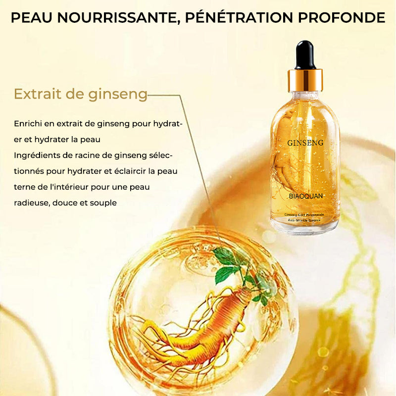 Un ginseng par bouteille: notre essence anti-âge au polypeptide de ginseng favorise l'élasticité et l'éclat de la peau.