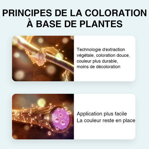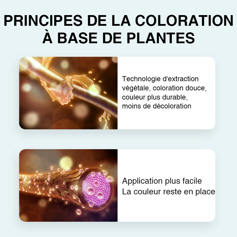Principe de la coloration végétale: Exploitez la puissance de la technologie des extraits de plantes pour une coloration douce mais efficace. Ce procédé doux protège également vos cheveux tout en garantissant une couleur durable.