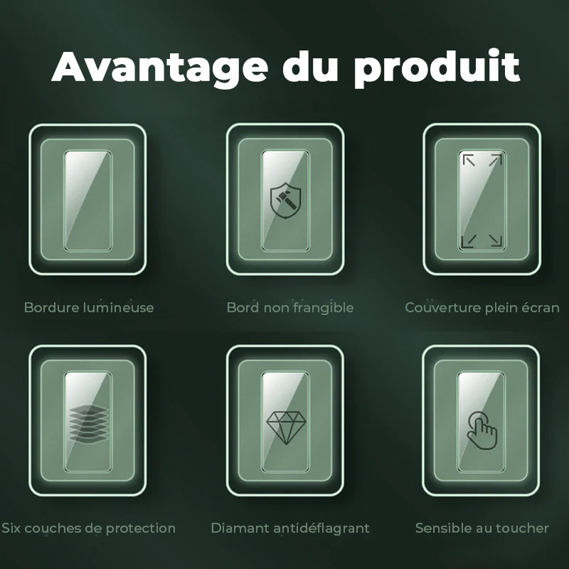 • UNE NOUVELLE FAÇON D'AMÉLIORER LE LOOK DE VOTRE TÉLÉPHONE! - Le SCREENSABER est une conception originale d'un protecteur d'écran qui fait briller votre téléphone dans le noir ! il est construit avec des bords brillants en silicone rebondi qui donnent un look incroyable à votre téléphone.