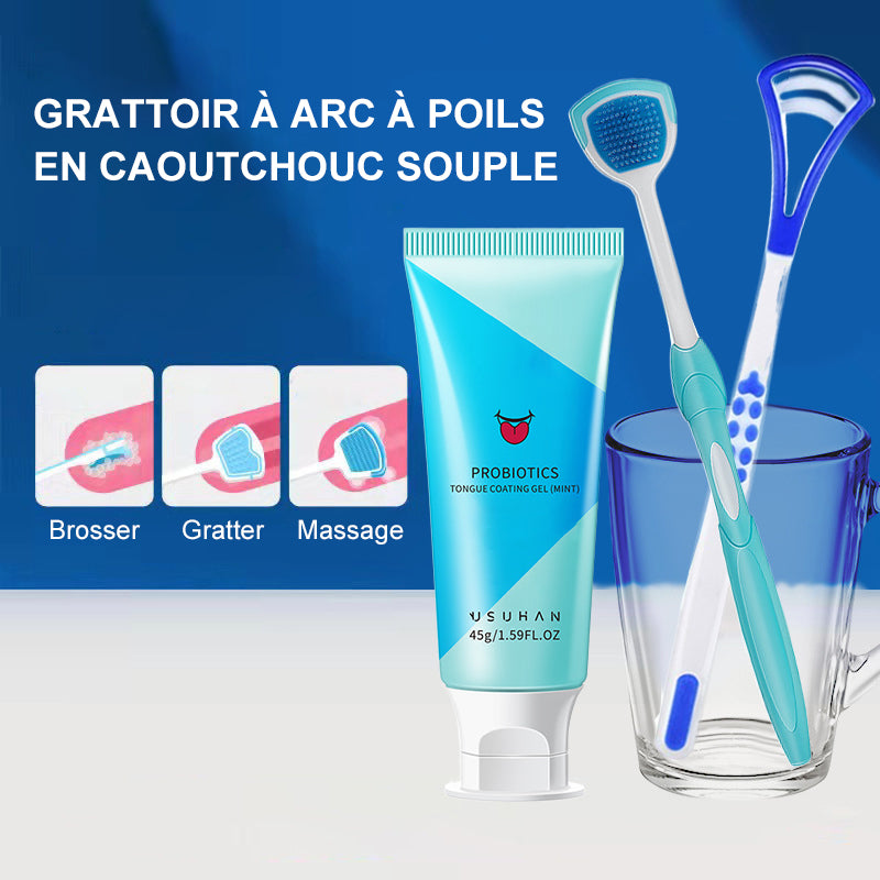 DÉVELOPPÉ PAR UN DENTISTE POUR ÉLIMINER LA CAUSE DE LA MAUVAISE HALEINE: La recherche dentaire prouve que 90 % des microbes de la mauvaise haleine vivent sur la langue et que le seul moyen de les éliminer efficacement est à la main. La brosse est conçue pour percer la plaque collante de la langue et pénétrer dans les coins et recoins de la langue où les microbes se cachent, laissant votre bouche visiblement plus propre. Le Gel Original : Le Gel contient du zinc, qui élimine naturellement et en toute sécurité la mauvaise haleine.