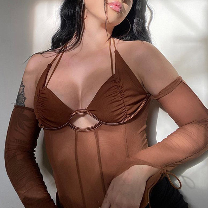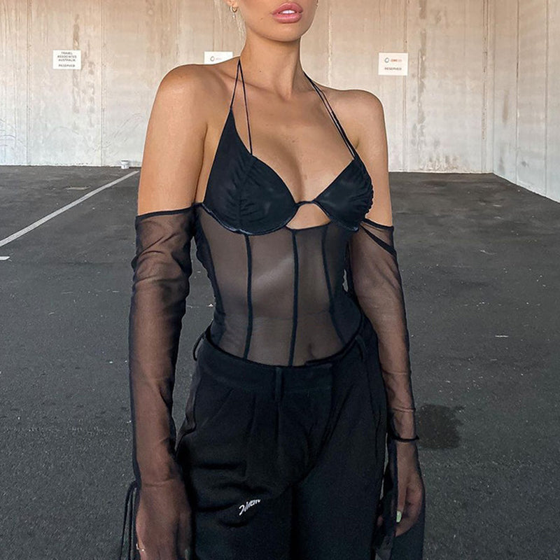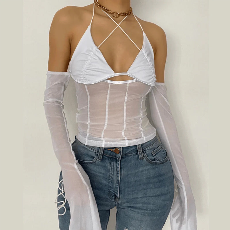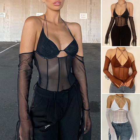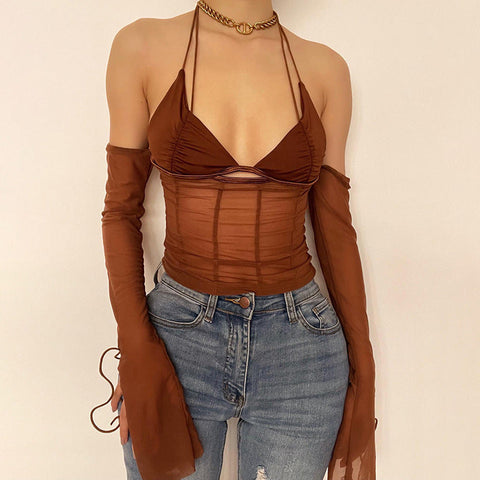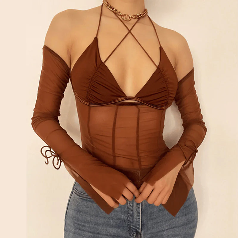- 1* Haut à Licou En Maille Transparente à Épaules Dénudées