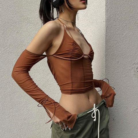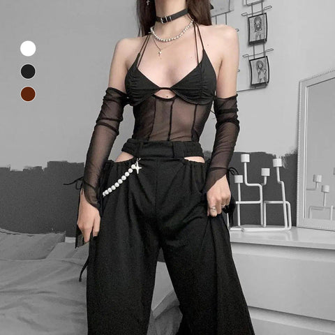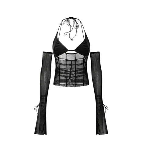 【CONCEPTION】 Haut cami sexy en maille transparente contrastée, manches longues évasées, dos nu, col licou à nouer, haut court à bretelles spaghetti, épaule dénudée, col en V profond, dos ouvert, couleur unie, coupe ajustée. Streetwear d'été vintage, tenues de soirée clubwear sexy pour filles. Bodyshaper de l'an 2000, chemise à cami courte noire harajuku goth.
