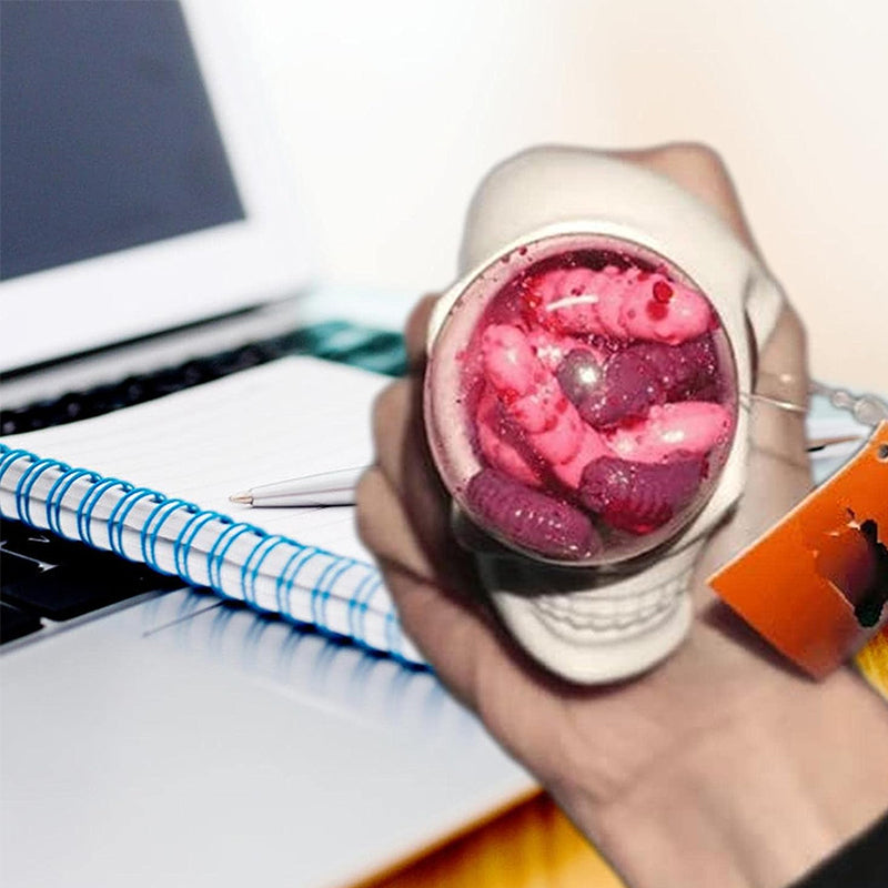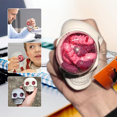 LES BOULES DE STRESS HALLOWEEN LES PLUS AMUSANTES: Lorsque vous pressez les crânes, leurs globes oculaires se gonflent et deviennent des sphères aux formes étranges, remplies de petits reptiles rampants et sanguinolents.