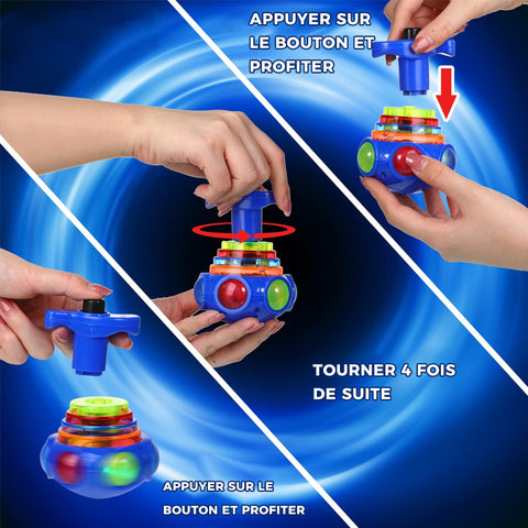 Facile à jouer - Livré avec un lanceur. Il suffit de placer le lanceur sur le dessus, de tourner la manivelle 4 fois, puis d'appuyer sur le bouton de démarrage pour faire tourner la toupie.