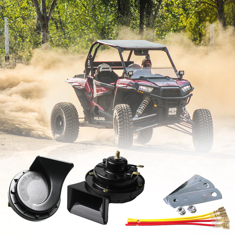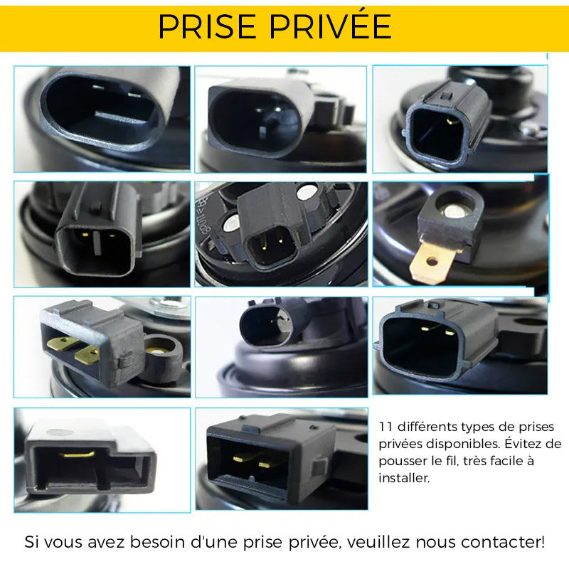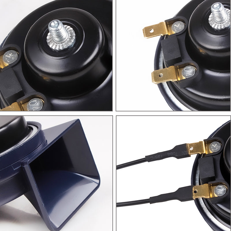 Supports de montage: permet un montage facile sur n'importe quelle moto. Peut être attaché au boulon de klaxon d'origine, à la barre de cadre avant ou à n'importe quel boulon disponible. Vous pouvez également séparer les klaxons et les installer de chaque côté de votre véhicule.