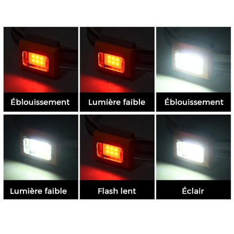 Vitesse : 6 vitesses : lumière blanche brillante-lumière blanche faible lumière rouge clignotante-double lumière rouge/blanche rouge vif-lumière rouge faible