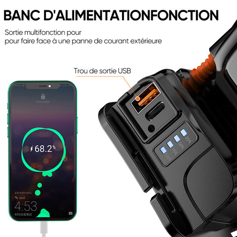 Fonction de banque d'énergie - La lampe frontale est livrée avec 2 batteries intégrées de 1200mAh qui permettent de recharger les téléphones portables à tout moment en extérieur.