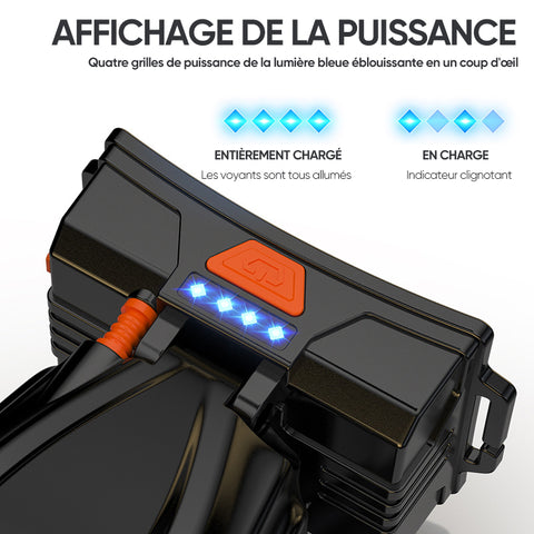Affichage de la puissance - La lampe frontale est dotée d'un affichage de la puissance à quatre grilles de lumière bleue éblouissante qui vous permet de vérifier facilement le niveau de puissance de la batterie. Lorsque la batterie est complètement chargée, les voyants sont tous allumés et lorsqu'elle est en charge, les voyants clignotent. Lorsque les 25 % restants de la batterie sont utilisés, il est important de la recharger à temps pour éviter de l'endommager.