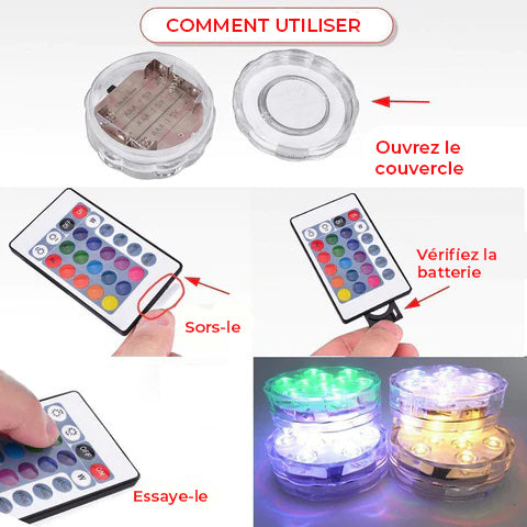 La lumière LED multicolore peut être allumée ou éteinte par télécommande, en utilisant des lumières LED submersibles car les lumières décoratives peuvent créer une atmosphère douce lorsque vous faites la fête avec votre ami.