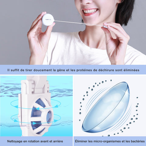 Mode d'emploi: Veuillez vous laver les mains avant utilisation, dévissez simplement le haut du nettoyant pour lentilles de contact, placez les lentilles dans le panier marqué R&L (gauche et droite), versez la solution de nettoyage dans la bouteille, puis tournez doucement la bouteille sur le bouton Couvercle pour un nettoyage rapide des lentilles de contact.