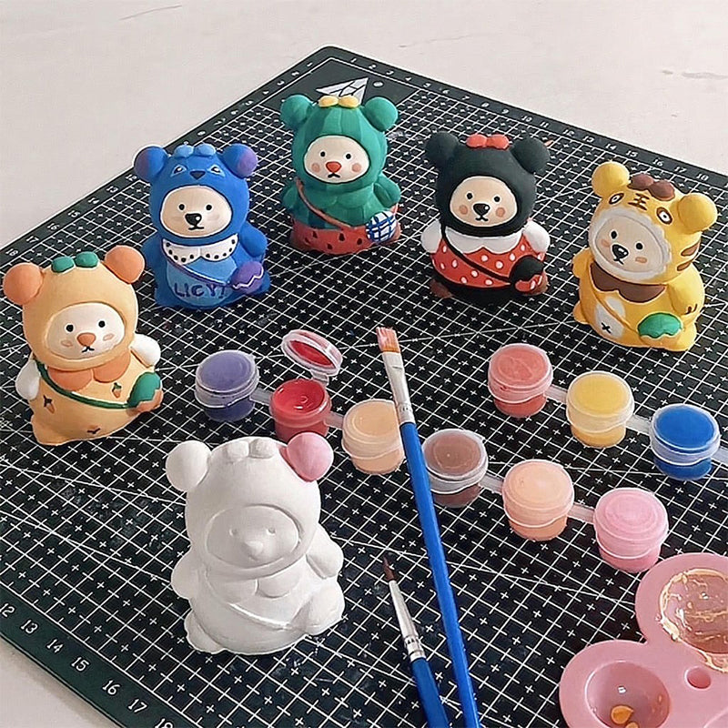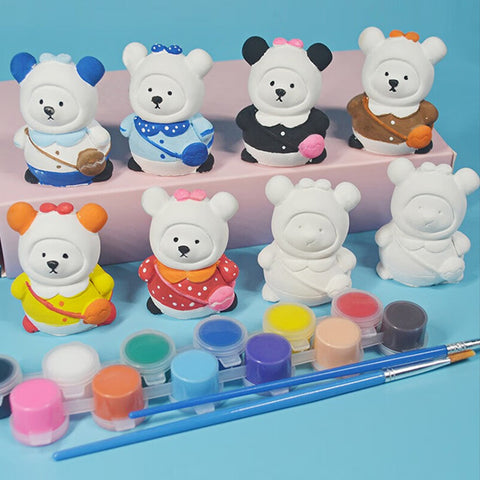 Le forfait comprend: moule à ours, pinceaux, peintures, plaques à dessin, tampons de protection, tablier jetable. Toutes les peintures sont des peintures acryliques très brillantes qui peuvent être séchées à l'air naturellement en 48 heures, ou peuvent être chauffées pour sécher à l'air pour accélérer.