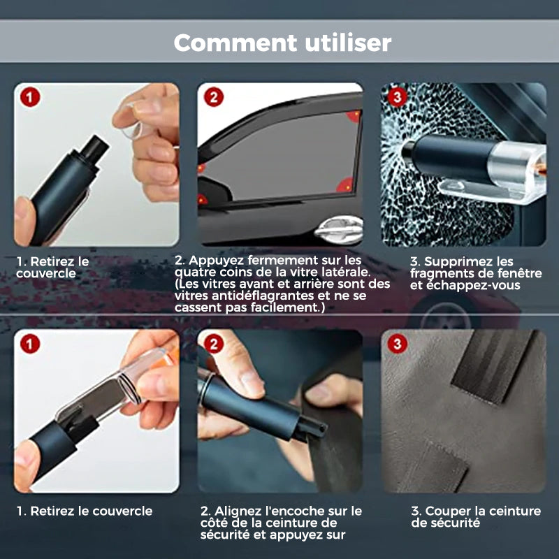• Portée: Facile à utiliser, aucune installation requise. Il est très important de le garder dans la voiture comme outil d'évacuation pour sauver le conducteur et les passagers piégés.