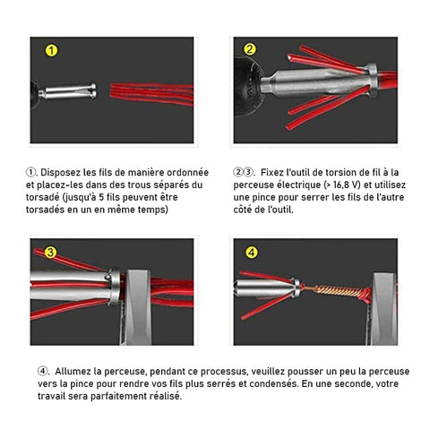 【Facile à utiliser】 L'outil de torsion de fil peut être fixé à une perceuse électrique ou à un levier manuel et à des fonctions ; Mettez deux ou trois fils ou plus dans la rainure correspondante, lorsque vous êtes prêt, allumez la perceuse ou le levier manuel, vous pouvez terminer le travail en douceur.