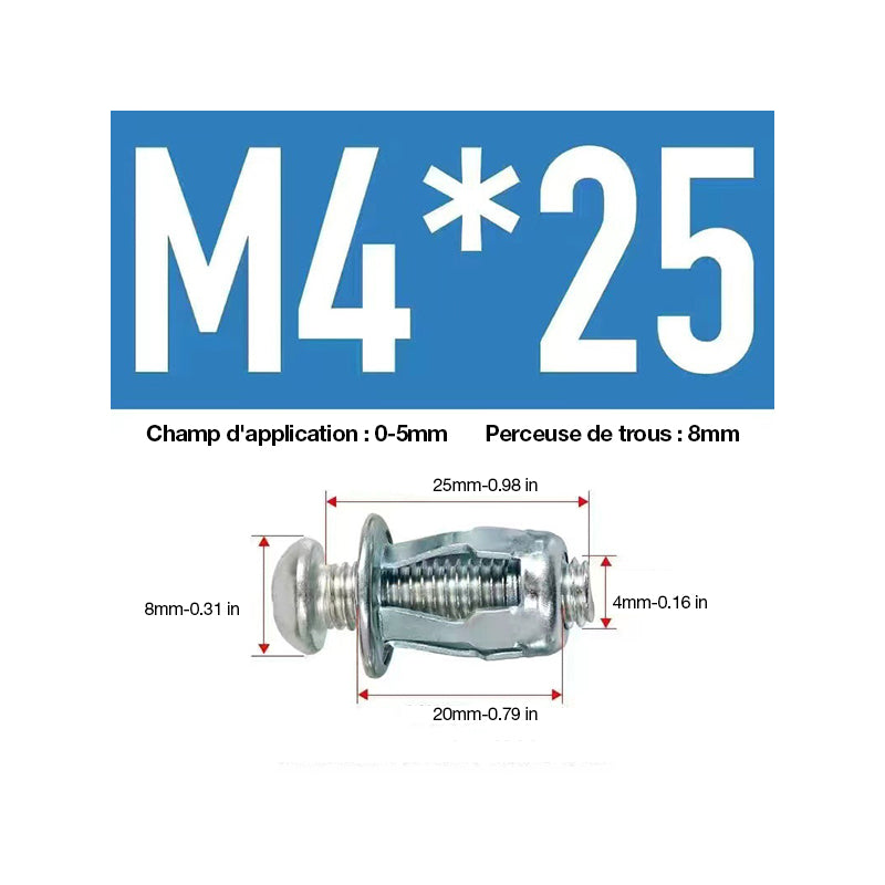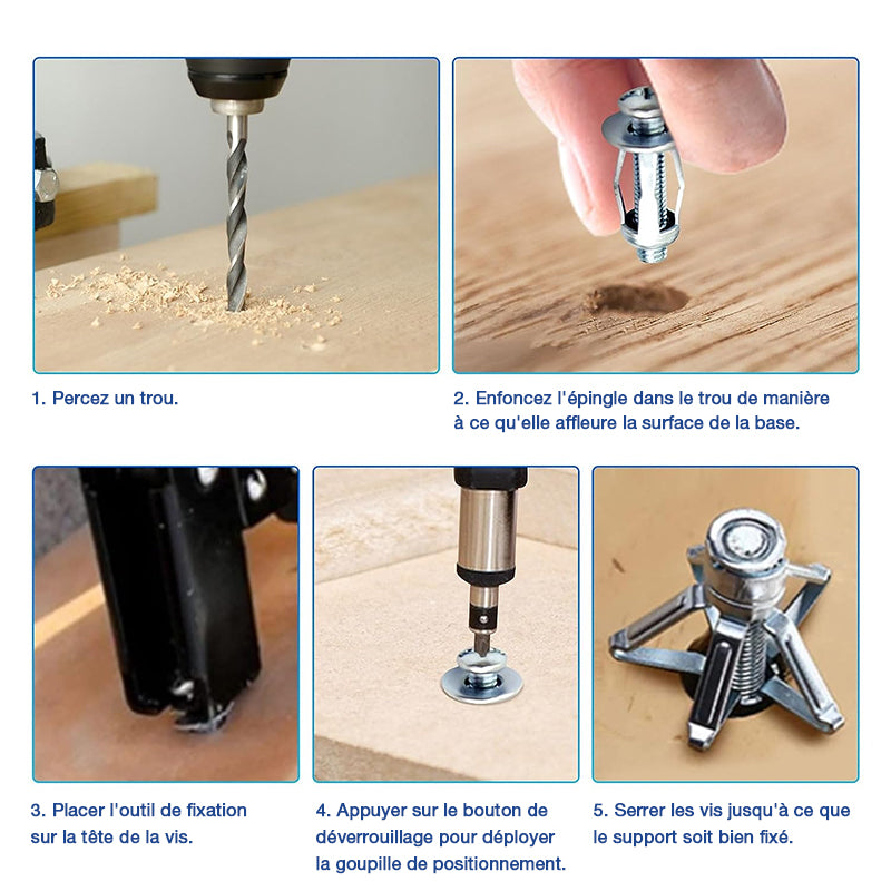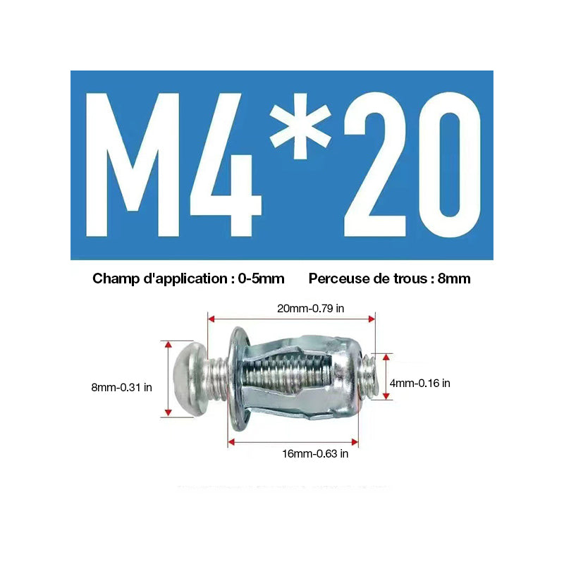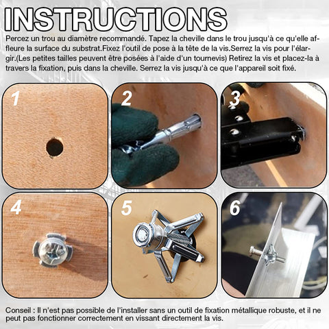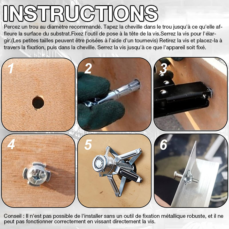 ✅ Facile à utiliser -------- 1. Percez un trou au diamètre recommandé. 2. Taper l'ancrage dans le trou jusqu'à ce qu'il affleure la surface du support. 3. Fixer l'outil de pose à la tête de la vis et serrer l'outil pour étendre la cheville (les petites tailles peuvent être posées à l'aide d'un tournevis). 4. Retirer la vis et la placer dans la fixation, puis dans l'ancrage. Serrer la vis jusqu'à ce que l'appareil soit fixé.