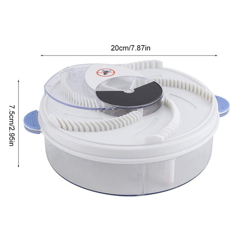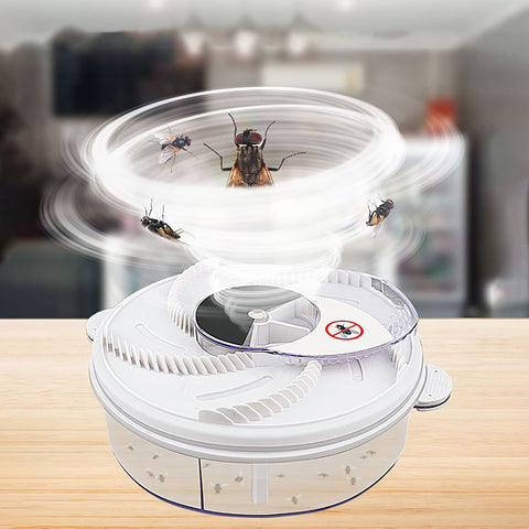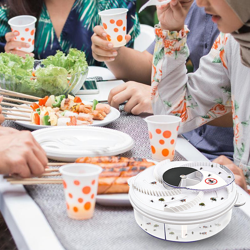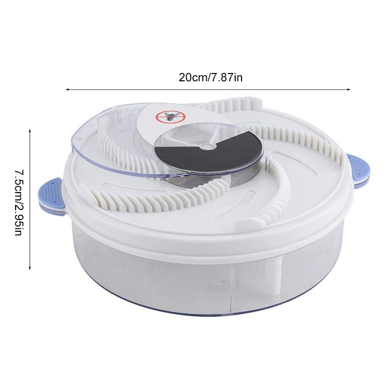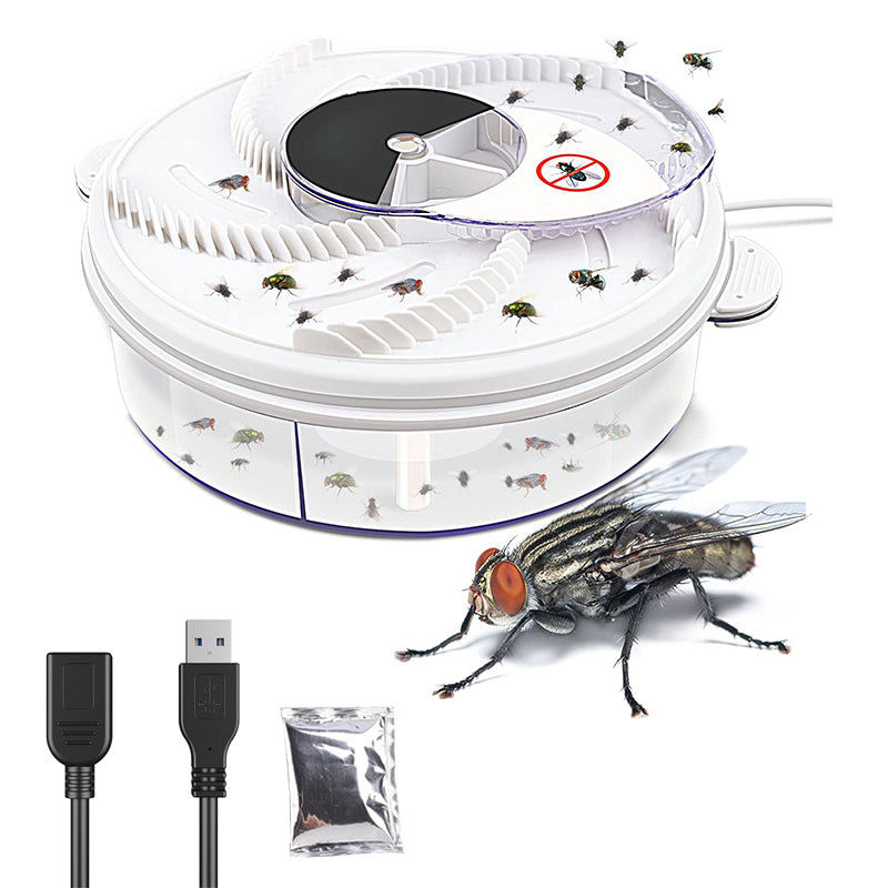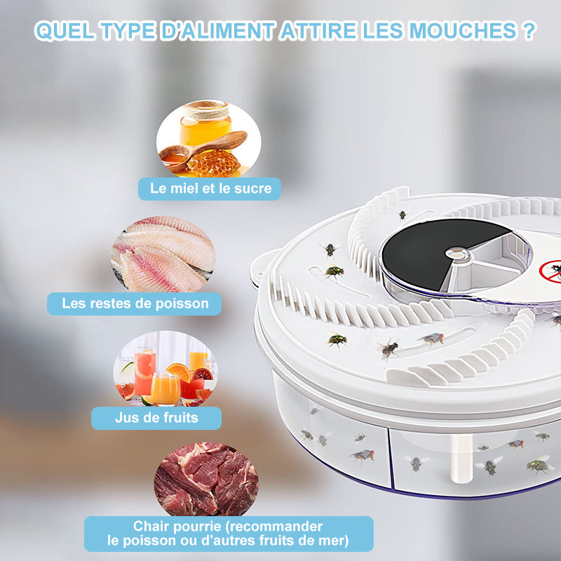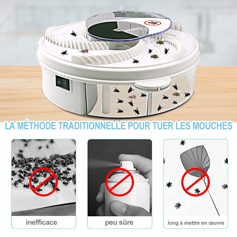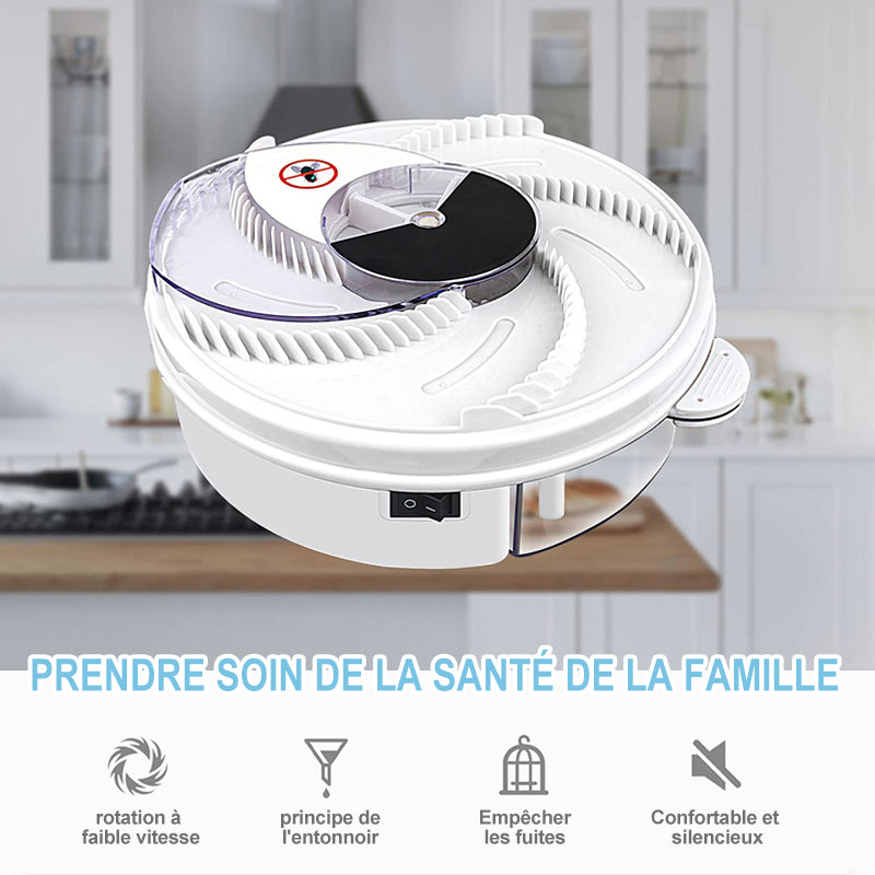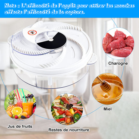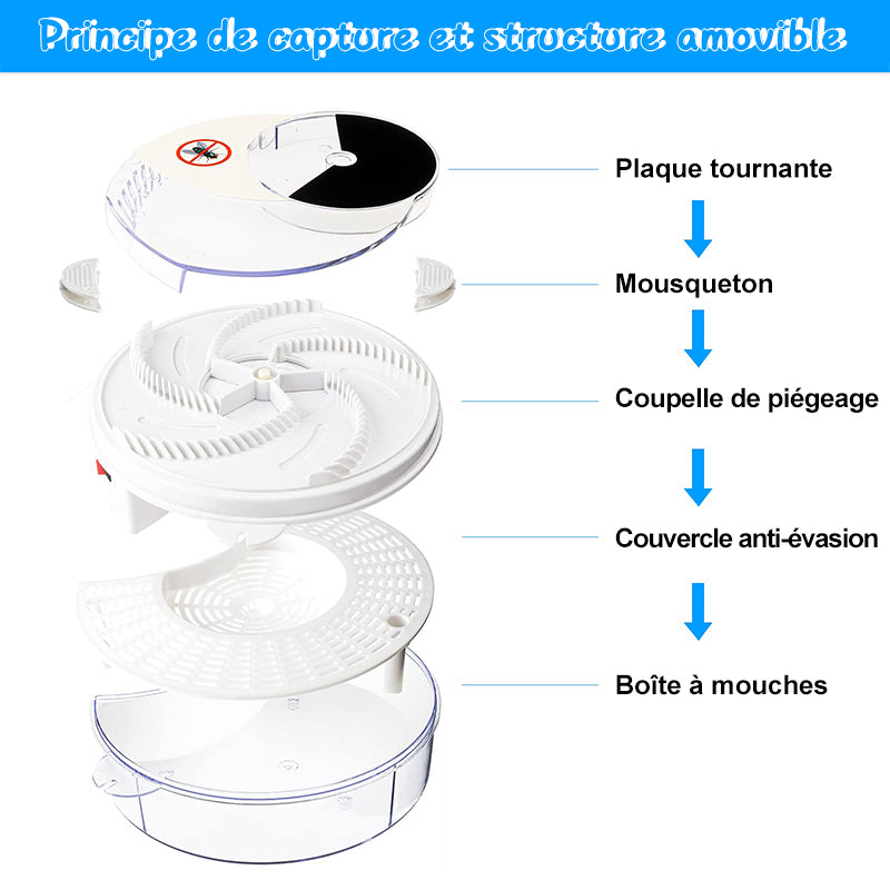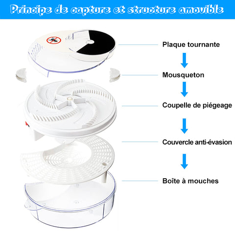 • Principe de capture: de l'eau sucrée ou des miettes d'aliments mous sont placés dans 5 stations d'appât sur le piège à mouches électrique ; lorsque les mouches se régalent, les bras rotatifs les balayent, les emprisonnant à l'intérieur ; elles volent dans le bac de collecte et meurent quelques jours plus tard ; tirez sur le fond pour vider le bac.