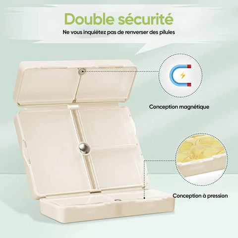 [Conception magnétique]: la conception magnétique est pratique à ouvrir et à fermer, et la conception à double couche fermée empêche les pilules de tomber, offrant une protection contre les pilules à double couche. Le bouton-pression reste fermé lorsqu'il est verrouillé et s'enclenche en toute sécurité pour garder les pilules en sécurité. Le récipient extérieur et chaque compartiment ont un couvercle qui empêche l'ouverture même en cas de chute.