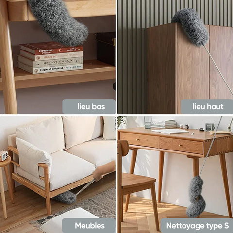 Grâce à la perche extensible, vous pouvez facilement atteindre des surfaces élevées telles que les plafonds, les ventilateurs et les cadres photo sans avoir besoin d'une échelle ou de vous tenir debout sur une chaise.