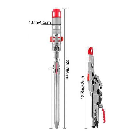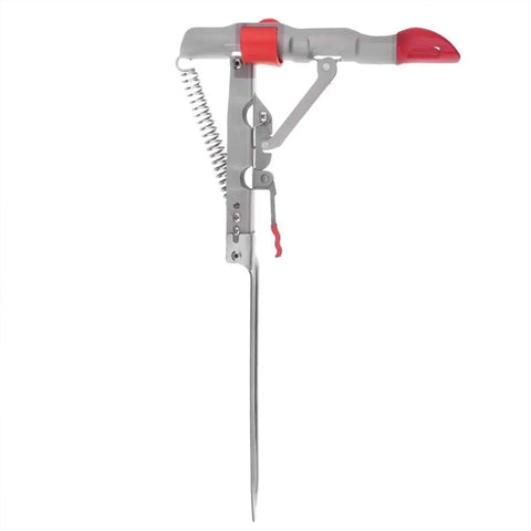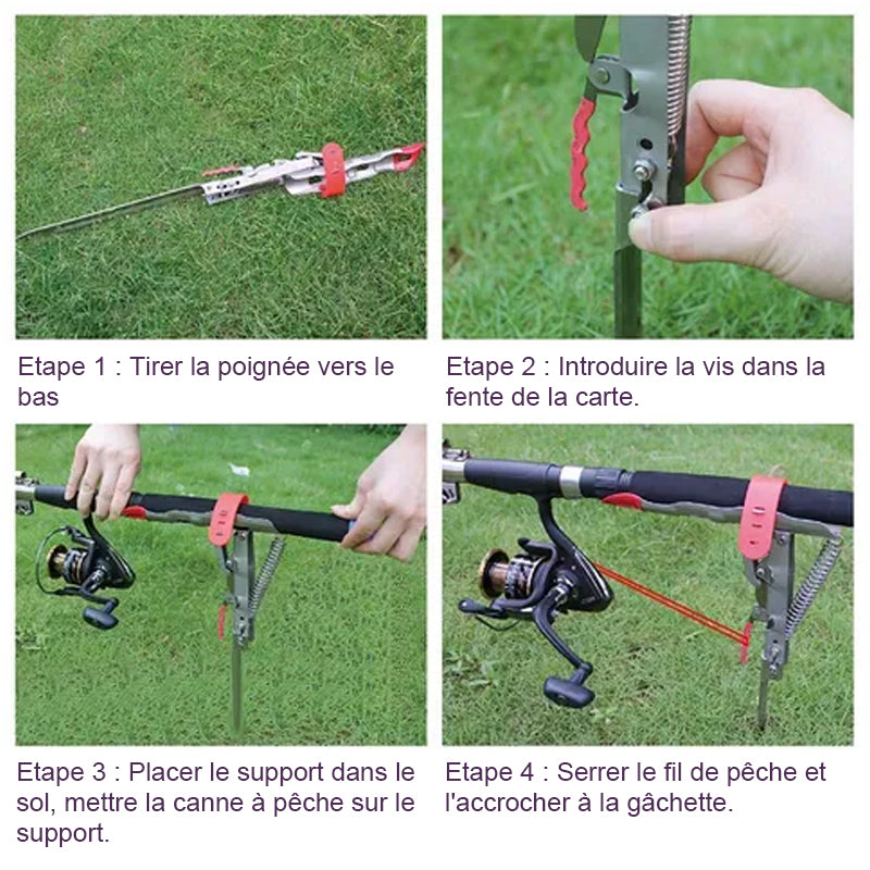 3. insérer dans le sol, mettre la canne à pêche sur le support (déjà lancée), tirer la poignée vers le bas jusqu'à ce qu'elle soit verrouillée.