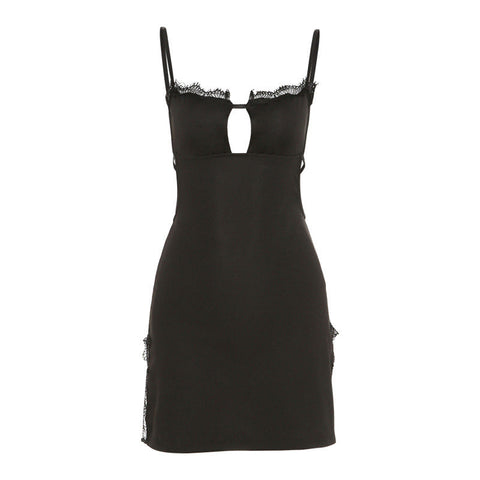 Design unique: Mini robe d'été sexy, bretelles spaghetti réglables, col en V en dentelle, liens, ourlet fendu en dentelle, sans manches, dos ouvert, fermeture à glissière au dos.