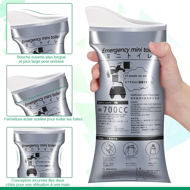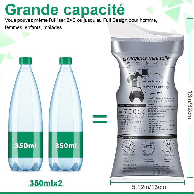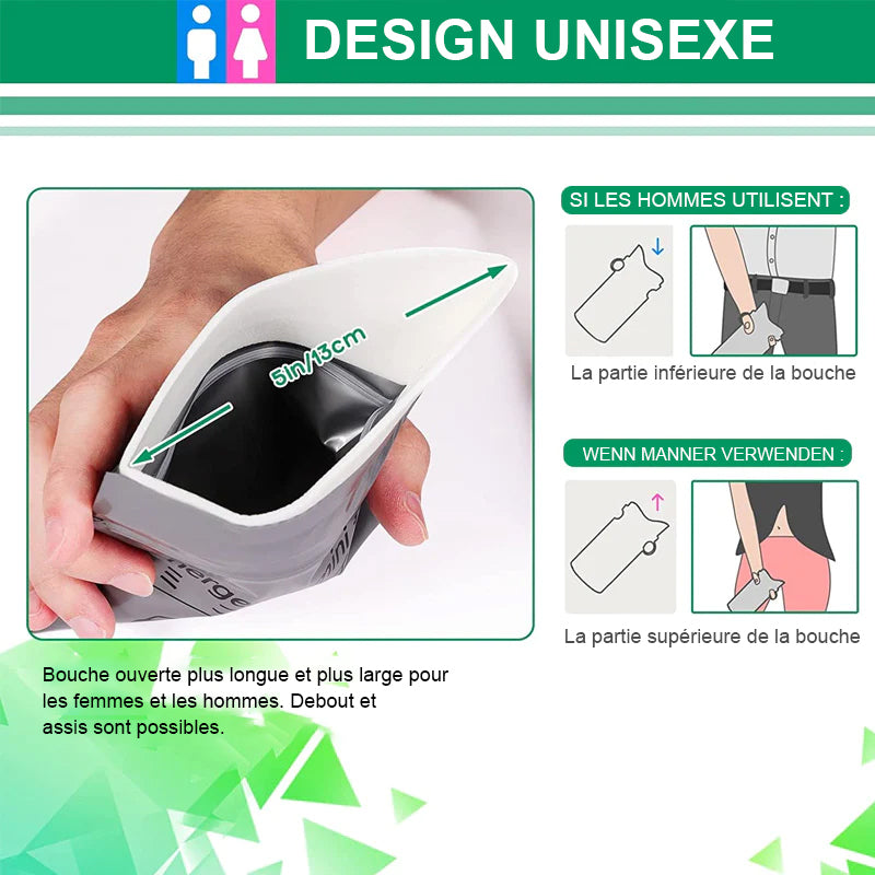 • Facile à utiliser et portable: Ouvrez simplement le sac à urine pour l'utiliser, et la conception incurvée sur les côtés permet une utilisation d'une seule main. Il est suffisamment pliable et compact pour tenir dans votre poche, votre sac à main ou votre sac à dos.