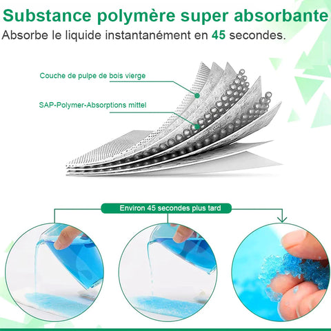 • Haute capacité d'absorption: ouvrez le sac d'urgence pour l'utiliser. Le sachet blanc est en polymère (n'a pas besoin d'être ouvert ou vidé pour être utilisé), absorbe les liquides dans le gel en 60 secondes, évitant les fuites et les odeurs, garantissant la santé et l'hygiène.