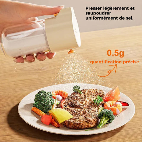 Précision quantitative : L'Organisation mondiale de la santé (OMS) recommande que la consommation quotidienne de sel soit inférieure à 6g. La bouteille de sel verse 0,5 g de sel par pression, ce qui permet de contrôler la consommation de sel, en particulier pour les personnes âgées.Suivez votre consommation quotidienne de sel avec notre distributeur de sel. Il distribue 0,5 gramme de sel par pression, ce qui permet un contrôle quantitatif du sel pour un régime alimentaire plus sain et plus conscient.