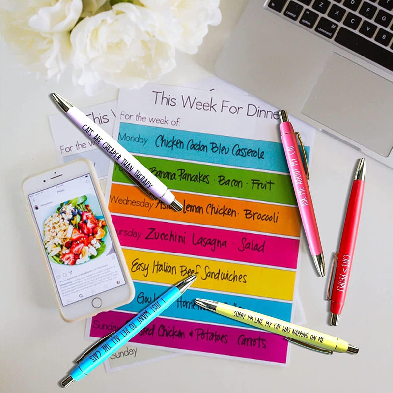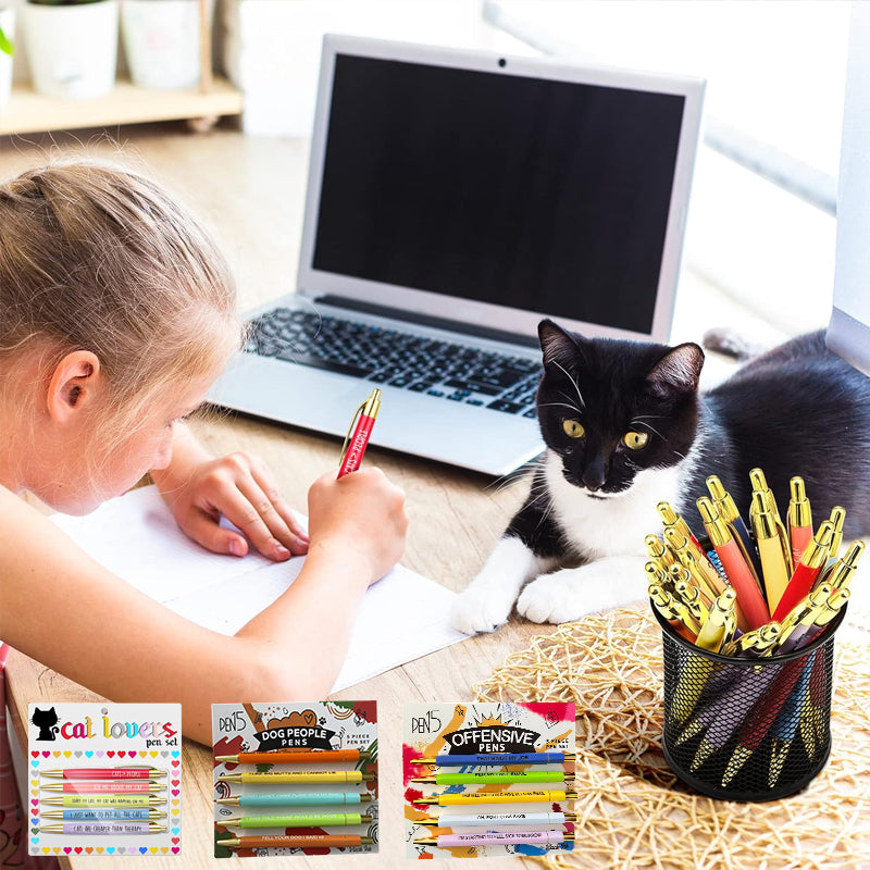 • 🌟 Couleurs différentes: Cet ensemble de stylos recueille cinq conceptions colorées différentes tandis que chaque stylo est livré avec une phrase drôle différente, ce qui rend amusant et pratique pour vous d'écrire, de dessiner ou de signer.