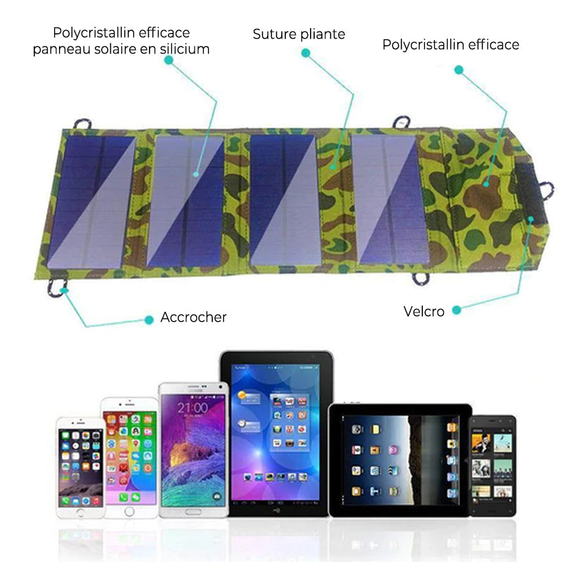 Compatible avec tous les appareils: vous pouvez utiliser le panneau solaire pour charger n'importe quel appareil tel qu'un iPhone, iPad, smartphone, caméra d'action, appareil Android, go-pro, GPS, haut-parleurs et bien plus encore.