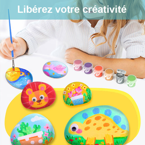 DESIGN UNIQUE ET FACILE À UTILISER. Notre kit de peinture artistique est livré avec différents types de peintures, d'autocollants, de pinceaux et d'autres fournitures d'artisanat pour les enfants ! Le kit de peinture sur roche est une excellente alternative car il encouragera vos enfants à aimer la nature. Cette activité pour enfants leur donne un sens de la création.